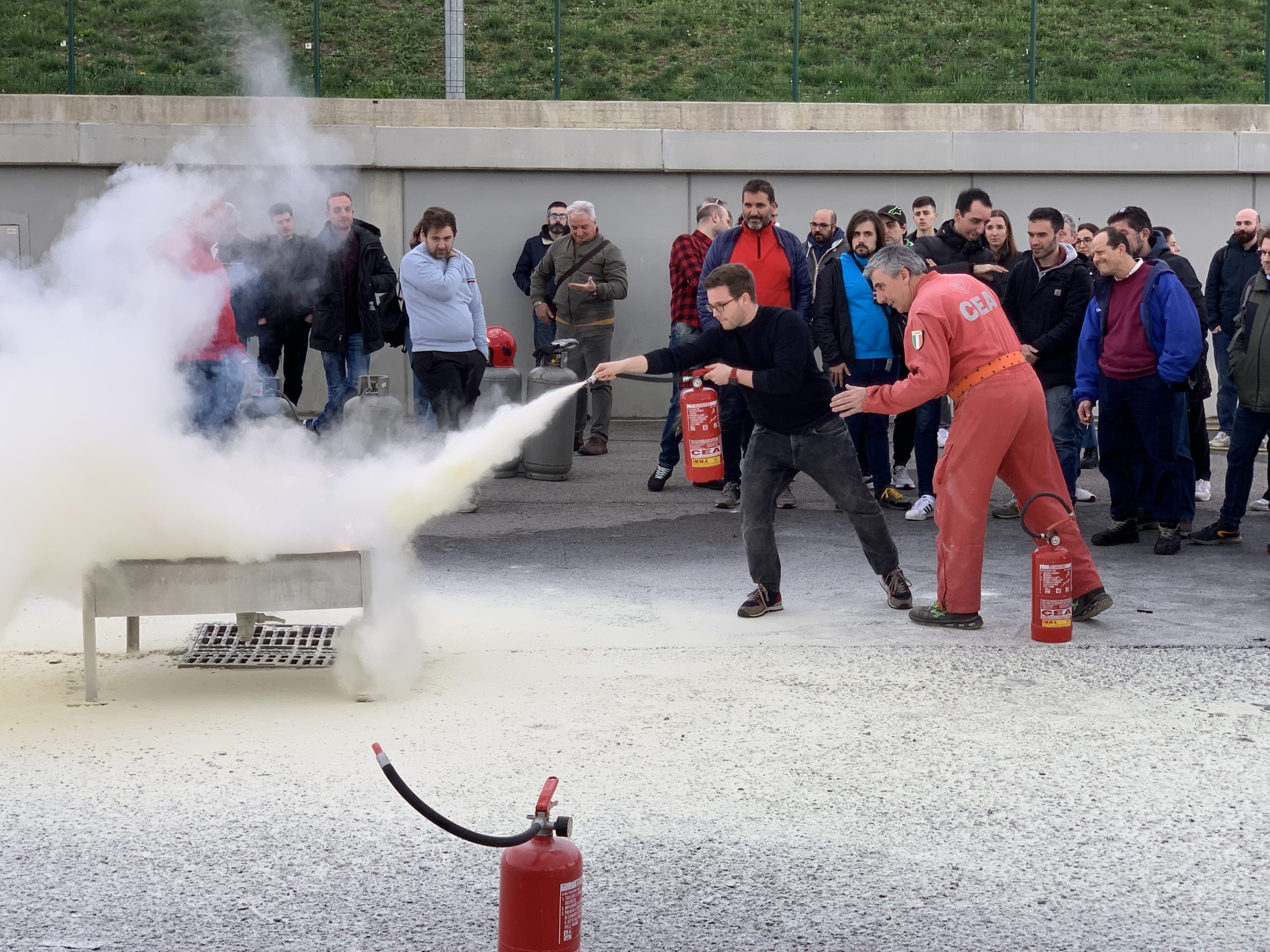 The first part of the course, promoted by Associazione Ufficiali di Gara di Firenze in collaboration with CEA and I.M.M.A., took place in the morning in the Media Centre of the circuit where, after greetings from our president and Clerk of the Course of the Mugello Circuit Antonio Canu , Riccardo and Alberto Del Sala, active members and backbone of CEA Squadra Corse, provided participants with the fundamental theoretical bases: from the elements necessary for combustion to occur, to the different types of extinguishing substances and their ideal applications, from the intervention methods in the event of a fire, to the methods for recovering cars on the track.